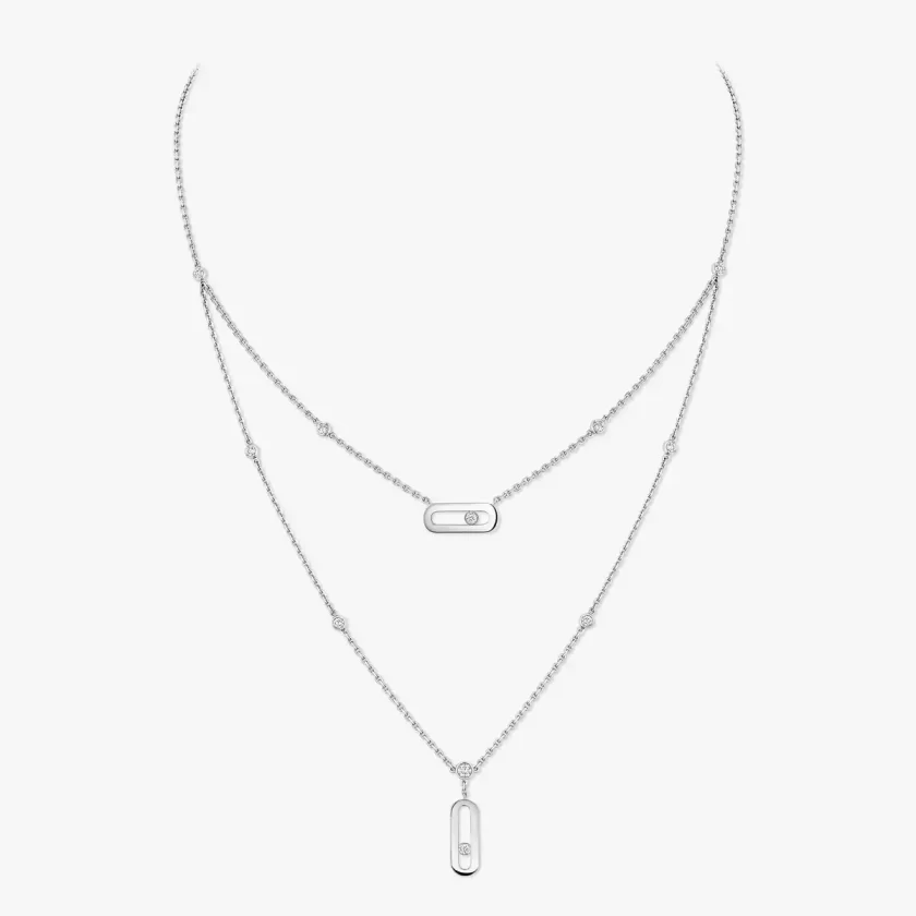 El Collar Messika Move Uno 2 Cadenas és una peça refinada i moderna que sublima la bellesa de l’escot amb un toc sofisticat. Aquesta joia, elaborada a mà en or blanc de 18 quirats, forma part de la col·lecció Move Uno, i es caracteritza per les seves dues cadenes, un Move Uno vertical i un Move Uno horitzontal, que es combinen en una harmonia perfecta.