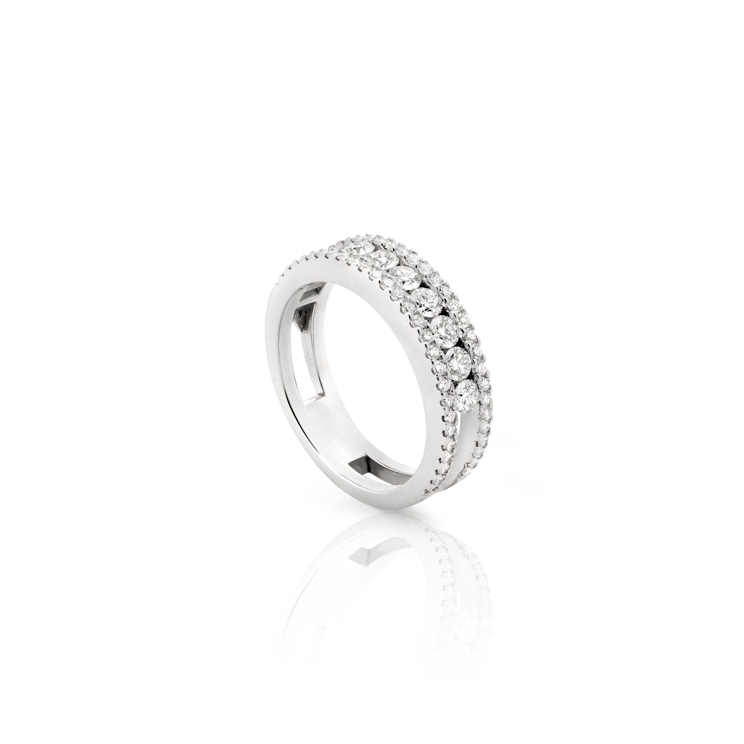 Handcrafted in 18 kt white gold with palladium alloy, the band features a double row of 7 diamonds (2.60 mm) and 54 diamonds (1.20 mm), meticulously selected by Nuri. With a total of 0.89 ct, these F color, VVS clarity diamonds capture the brilliance of pure light, revealing their exquisite radiance from every angle.